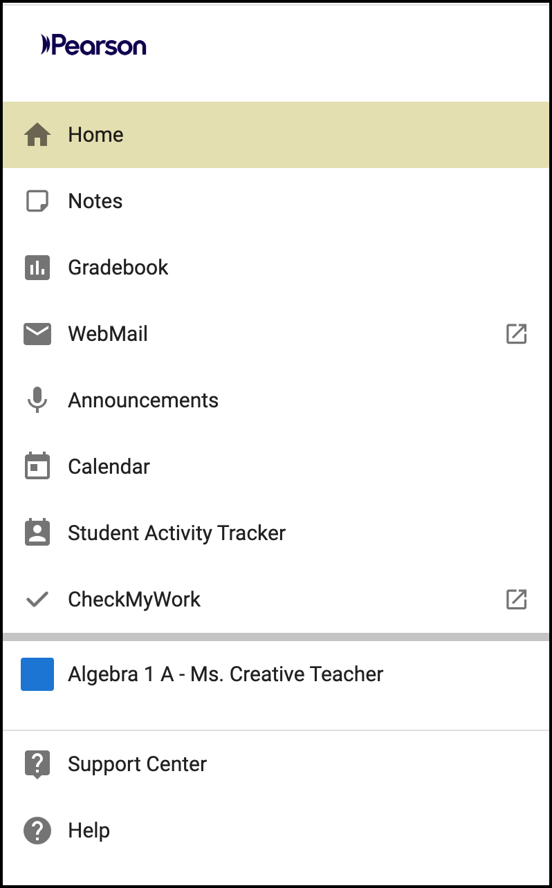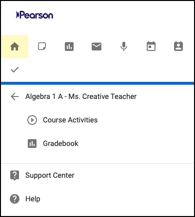 - Course menus: The courses you're enrolled in are listed under the Calendar. Select them to access the Course Activities and detailed Grades the selected course.